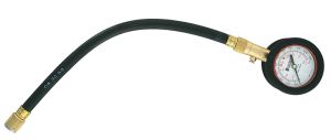 Includes hose extension, chuck and bleeder valve. Calibrated from 0-160 lbs. in 5 lb. units, and 0-1100 KPA Metric. Holds pressure read-out until released. 14 inch Flexible hose.