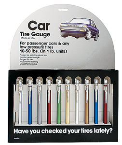 10 gauge package of pencil gauges. Calibrated 10 to 50 lbs. in 1 lb. units. Carton-to-counter shelf display. 5 pastel colors. Metal barrels, Nylon bar. sold in pack of 10