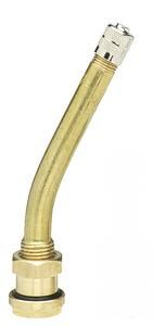 Bent brass valve for steel truck wheels with 9.7 mm (.390") rim holes. Complete with cap, core and built-in O-Ring. Effective length is 85mm. Bend angle 27 degree.
