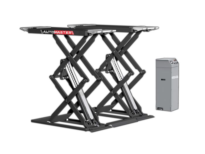 Item not available for on-line purchasing. Please contact Automaster 0800 214 604 or info@automaster.co.nz for a quote Delivery and install charges will apply. The Automaster AM-7130DH full rise scissor lift combines an extremely low lift platform height of 100mm and an impressive1900mm full height position. A full rise scissor lift that is the perfect above ground, or flush mounted lift for those customers with ceiling height or width restrictions. Supplied standard with one set (4) 40mm rubber lifting blocks, one set (4) 80mm rubber lifting blocks Air regulator/moisture trap & oiler, and oil hose covers. Lifting Capacity 3000kg Lifting Height 1900mm Min Height 100mm Motor Power 2.2kw Weight 960kg Lifting Time (Approx) 50-60s External Dimensions 1900(L)*2050(W)*115(H)mm