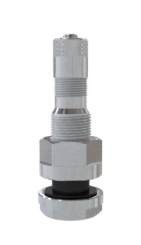 Straight nickel plated valve for steel truck wheels with 9.7 mm (.390") rim holes. Complete with cap, core and built-in O-Ring. Effective length is 49mm. Bend angle 0 degree.