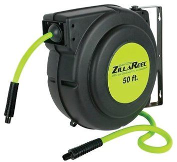 Top quality enclosed plastic ari reel loaded with Flexzilla premium air hose with bend restrictors Extreme all weather flexibility, even in sub-zero temperatures (-40 degree to 150 degree Fahrenheit) Includes bend restrictor that reduces wear and tear, prolonging the life of the hose Anodized aircraft aluminum fittings Maximum reel working pressure: 150 PSI Flexzilla Air Hose is a revolutionary hose featuring a Premium Hybrid Polymer material that redefines flexibility. Flexzilla hose characteristics offer zero memory allowing it to lay-flat exactly where you drop it and won't work against you during operation or coiling after use. With reusable fittings, Flexzilla offers extreme all-weather flexibility, even in sub-zero conditions. Flexzilla Air Hoses offer superior flexibility for tight radius bends in both cold and warm environments. 300 PSI, Kink proof hose. Engineered polymer-blend material permits use in environments where general purpose PVC and rubber hoses may become too stiff. Made from high impact plastic. Auto-rewind with positive latching mechanism. Mounting bracket for wall or ceiling.