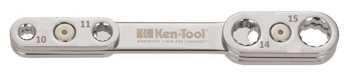 The Ken-Tool 8-in-1 Wrench Metric version, delivers strength, versatility and convenience in a 190mm, 350gm slim-profile tool. The wrench is fabricated from cold-forged, high-strength vanadium steel alloy. At the heart of the wrench is the “Slide-Twist-Slide” design to quickly change wrench sizes. To change the size, the user slides the carrier to the center, twists it 180 degrees and slides back to lock in place. This metric version (#35776) has 10mm, 11mm, 12mm, 13mm, 14mm, 15mm, 16mm and 17mm sizes. The “Stud-Thru” feature permits studs and bolts to pass through the opening. The 12-point closed box design needs only a 30-degree re-engagement arc for tight clearances.