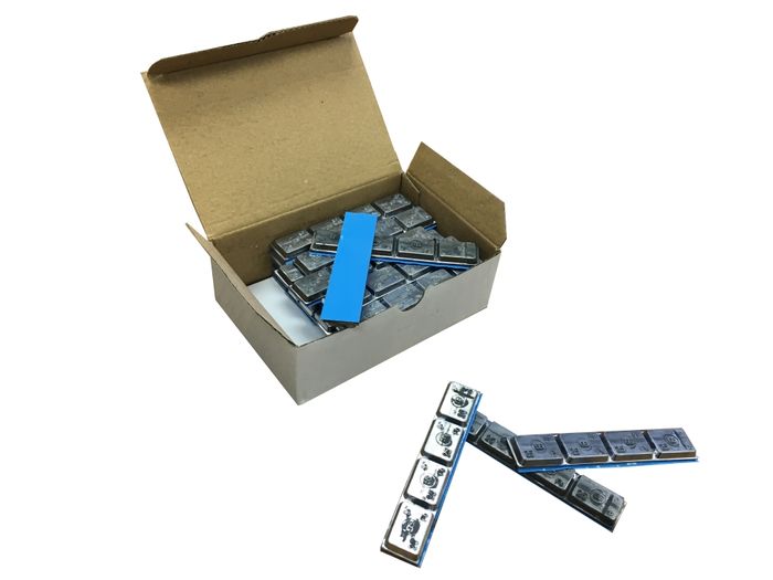 Lead based (PB) "Ecobalance" adhesive weight. 30 strips of 25gm zinc plated segments packed in a cardboard box. Made with blue backed adhesive tape with a convenient pull off tab. Great value, no waste, proven in NZ conditions. Economical and eco-friendly.