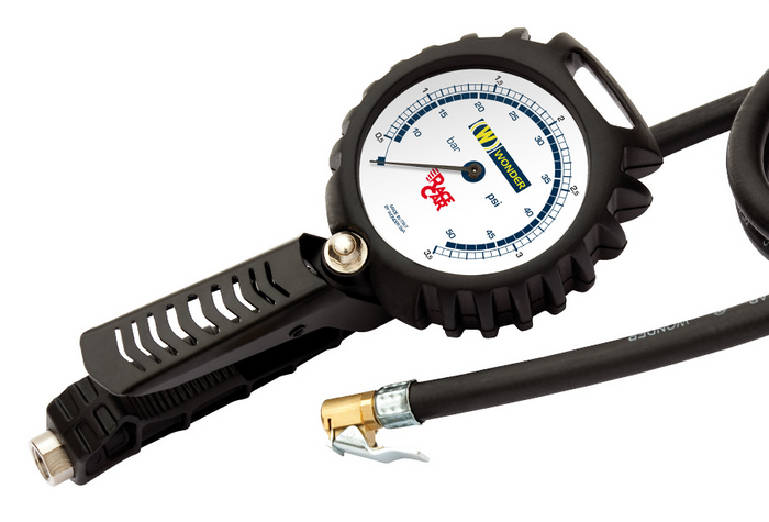 W1997 Race car model. Premium quality inflator. Graduated 7 - 50 PSI 1.5 mtr hose length. Maximum pressure 50 PSI. Lever inflate, push button deflate. Swivel air inlet eliminates hose kinking. Hanging bracket and comfortable grip. Also available: W1991 Same but graduated 10 - 174 PSI