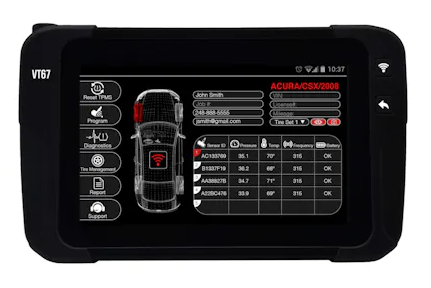With interactive menus, complete TPMS diagnostic capability, and even built-in support, the VT67 will completely re-imagine the way technicians diagnose and validate TPMS systems. The tool boasts over 30 features and functions, as well as a built-in camera to document any vehicle issues, which can then be added to a complete TPMS report and emailed to the customer.